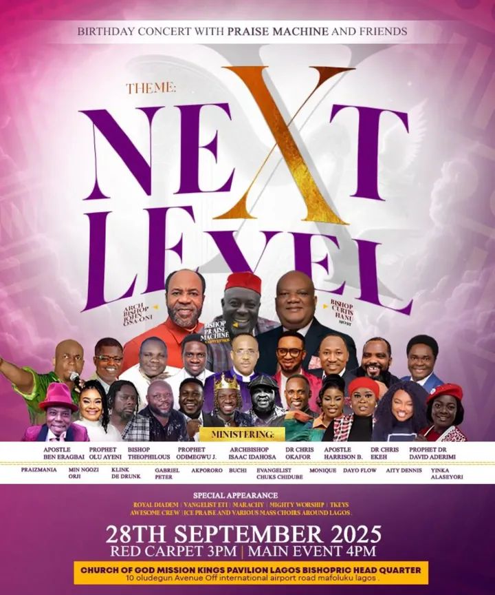Praise Machine, on his Facebook page, declared the concert in commemoration of his birthday’s celebration as Next Level birthday concert. His words: Guest what, something is about to hit Lagos as never before. It’s the Next Level concert; that is my birthday concert on the 28th, September 2025 at 4pm. Red carpet starts 3pm.”