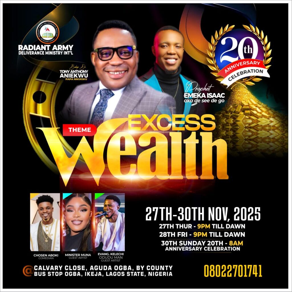 Bishop (Dr.) Tony Anthony, the General Overseer of Radiant Army Deliverance Ministry International, Ogba, Lagos, expresses gratitude to God as the powerful prophetic church celebrates Sunday November 30, 2025, her 20th anniversary with declaration of Excess Wealth as theme of the celebration. The widely traveled prophet shares with Christian Benefits the big strides of the church in two decades. Excerpts