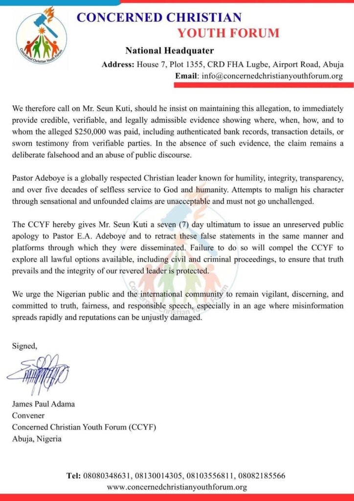 The CCYF hereby gives Mr. Seun Kuti a seven (7) day ultimatum to issue an unreserved public apology to Pastor E.A. Adeboye and to retract these false statements in the same manner and platforms through which they were disseminated. Failure to do so will compel the CCYF to explore all lawful options available, including civil and criminal proceedings, to ensure that truth prevails and the integrity of our revered leader is protected.