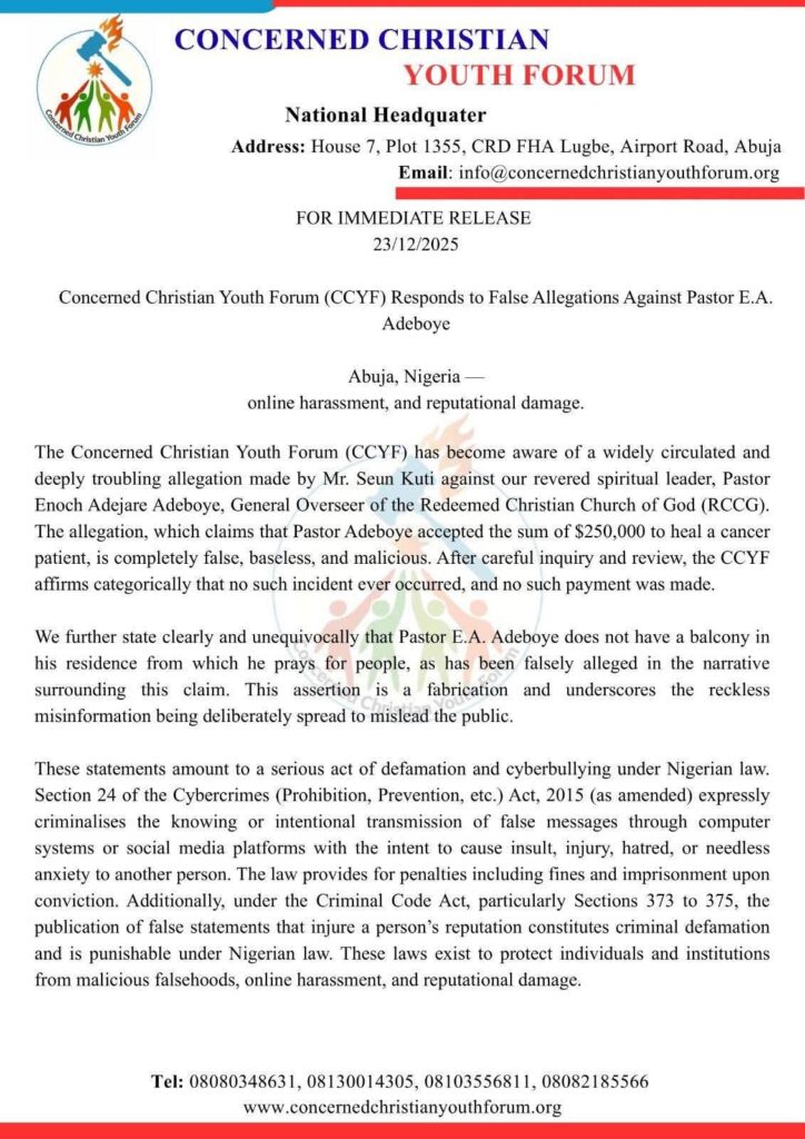 The Concerned Christian Youth Forum (CCYF) has become aware of a widely circulated and deeply troubling allegation made by Mr. Seun Kuti against our revered spiritual leader, Pastor Enoch Adejare Adeboye, General Overseer of the Redeemed Christian Church of God (RCCG). The allegation, which claims that Pastor Adeboye accepted the sum of $250,000 to heal a cancer patient, is completely false, baseless, and malicious. After careful inquiry and review, the CCYF affirms categorically that no such incident ever occurred, and no such payment was made.